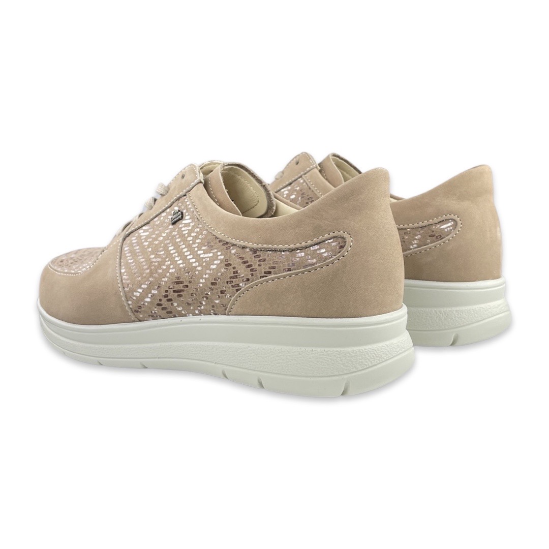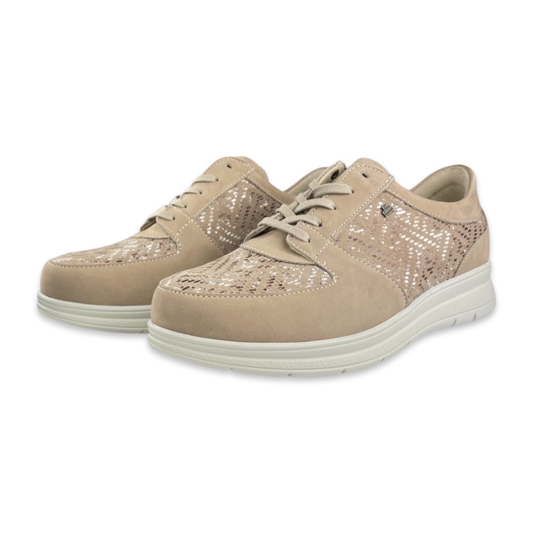 Deze veterschoenen van Finn Comfort de Royan in beige fantasie print leer is geheel leder gevoerd en heeft een fijne pasvorm. Het voetbed zorgt voor een goede ondersteuning tijdens het lopen. Bij Finn Comfort draait het vooral om wat u niet ziet. De combinatie van medische kennis, innovatieve toepassingen en traditioneel handwerk levert schoenen op die perfecte ondersteuning bieden. Het voetbed in deze schoen is uitneembaar