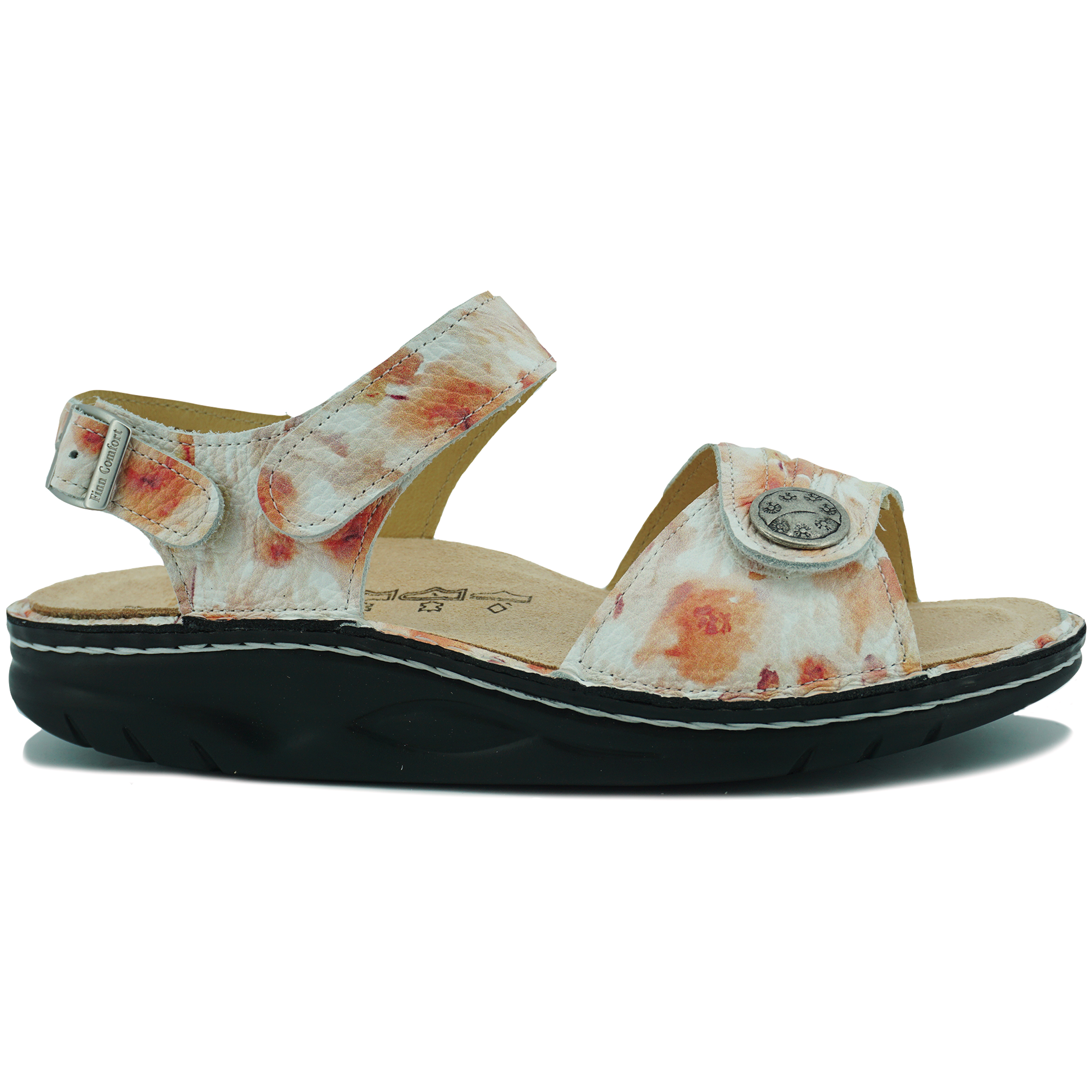 Finn Comfort 1572 Sausalito peach bloemenMet deze sandaal ben je helemaal klaar voor de zomer. De rubberen zool zorgt ervoor dat je er de hele dag op kan lopen. De sandaal is verstelbaar door de klitterband en je kan de binnenzool eruit halen.